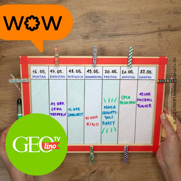 Mit dem GEOLINO TV Wochenplaner gerät nie wieder etwas in Vergessenheit! Alle Ereignisse der aktuellen Woche finden ihren Platz. So behältst du die Termine deiner Kids immer im Blick. Mit waagerechten Stichen kannst du den Kalender einteilen, sodass jedes deiner Kinder eine eigene Zeile für seine oder ihre Termine hat.