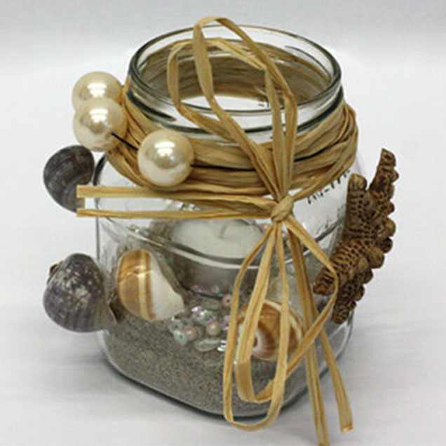 Geschafft! Umwickele nun den oberen Rand des Windlichts mehrmals mit Bast und optional mit deiner Perlenkette und schnüre einen Knoten oder eine Schleife. Fertig ist das Muschel Windlicht!