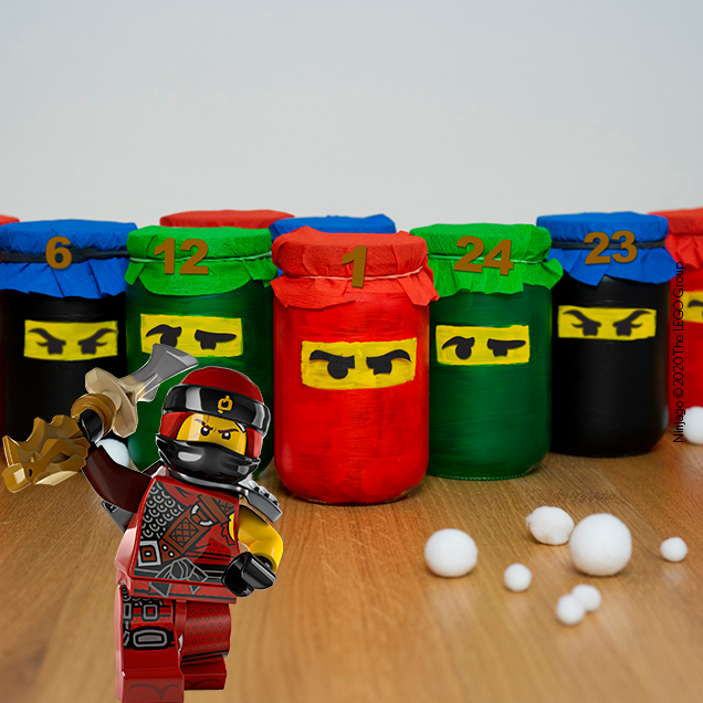 Das ist der coolste Adventskalender, den du finden kannst! Und super einfach nachbasteln kannst du ihn auch. Für kleine Ninjago-Fans genau das Richtige, um die Tage bis Heiligabend zu zählen. Du kannst die Gläschen mit Süßigkeiten und der ein oder anderen LEGO-Figur füllen. Aber pass auf, dass die Gläschen nicht schon vor Weihnachten als Spielfiguren auf große Abenteuersuche gehen!