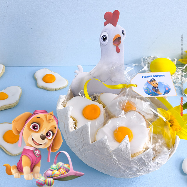 Henrietta aus der Serie PAW Patrol hat etwas ganz Besonderes ausgebrütet: Leckere Spiegeleier-Kekse. Hier zeigen wir dir, wie du die Plätzchen selbst backen und den schönen Osterkorb in Eierschalen-Optik nachbasteln kannst. Dieses PAW Patrol Ostergeschenk ist eine tolle DIY-Idee zum herkömmlichen Osterkorb und lässt das Herz eines jeden PAW Patrol-Fans höher schlagen.