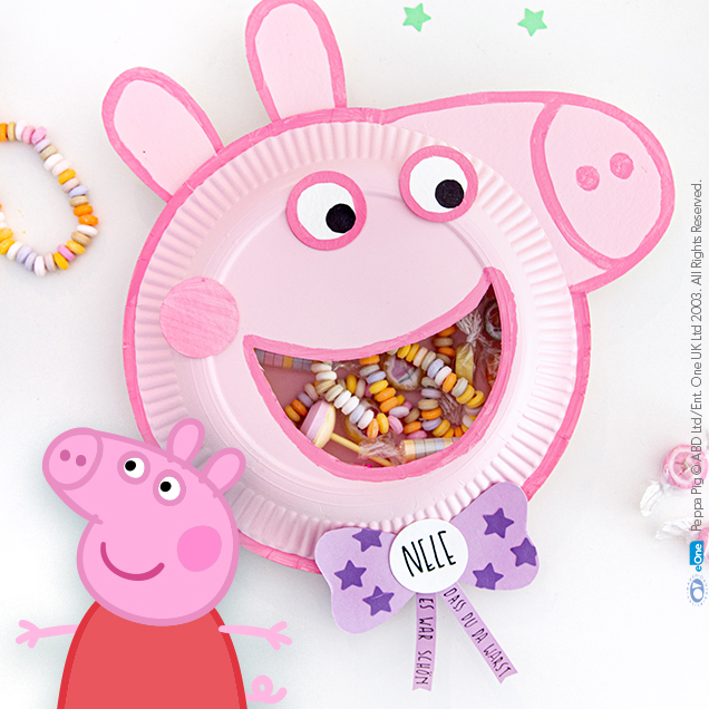 Einen zweiten Pappteller hinzunehmen und mit Süßigkeiten und Gastgeschenken füllen. Nun die beiden Vorderseiten der Teller (Peppas Gesicht und der gefüllte Teller) zusammenkleben.