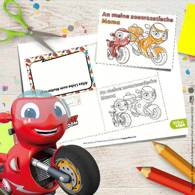 Zoomtastische Muttertags-Grüße an die Mamas! Auf der Ricky Zoom Muttertagskarte ist jede Menge Platz für bunte Kunstwerke und liebevolle Worte zum Muttertag. Die Vorlage findet ihr hier zum ausdrucken und selbst gestalten.