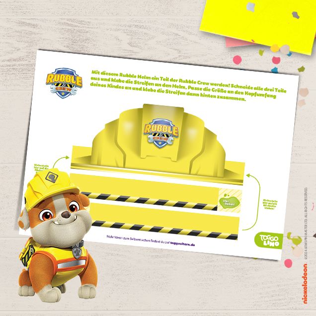 Deine Kleinen möchten auch Teil von Rubbles Crew werden? Mit dieser einfachen Vorlage von Rubbles Helm, die nur ausgedruckt und zusammengeklebt werden muss, gelingt das im Handumdrehen. Für Karneval ist der Helm zusammen mit der Rubble-Schminkanleitung, die ihr auch bei uns findet, ein tolles Kostüm.