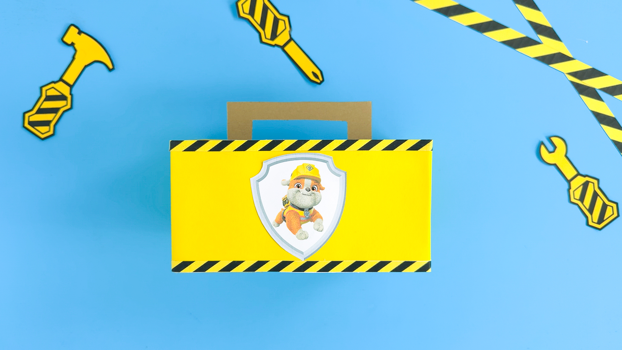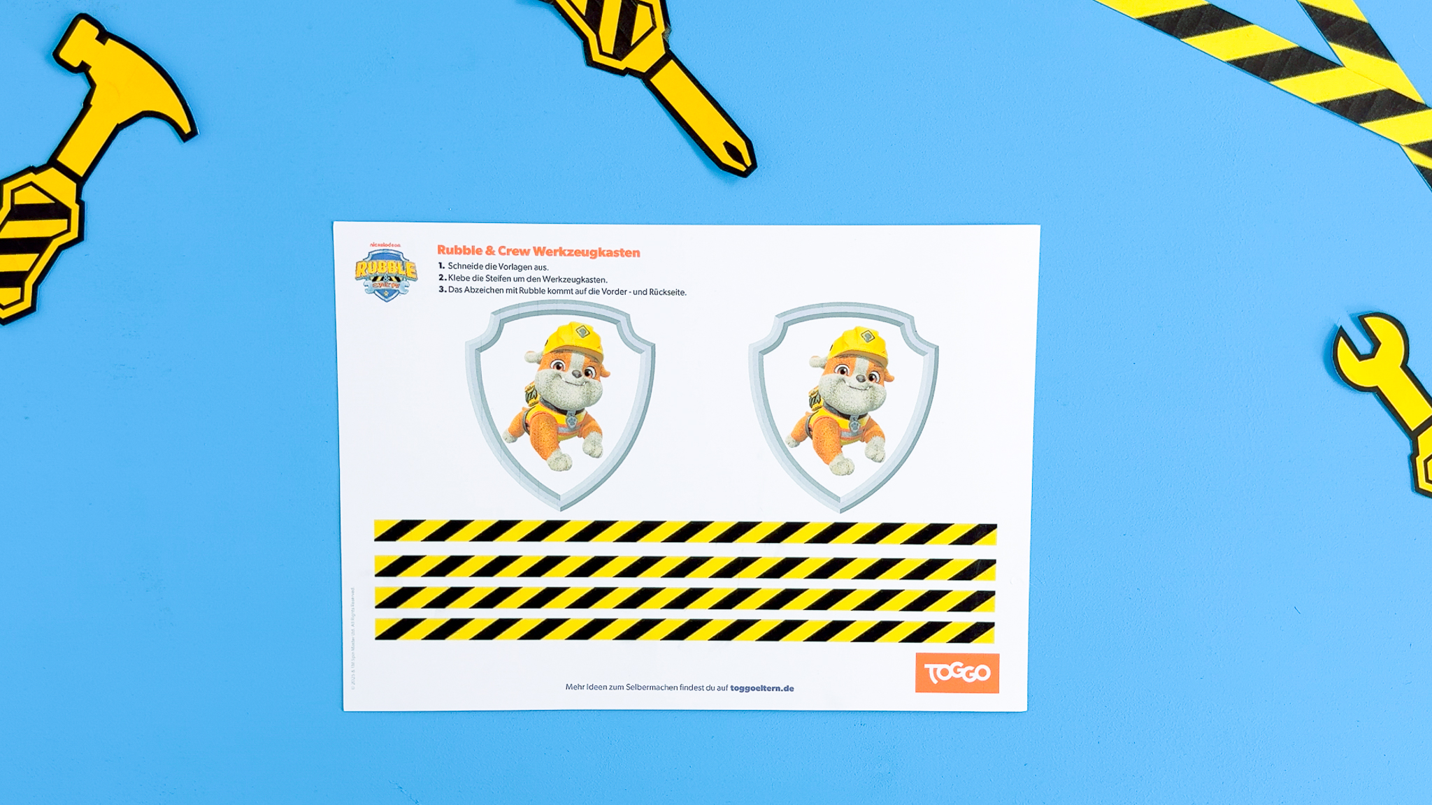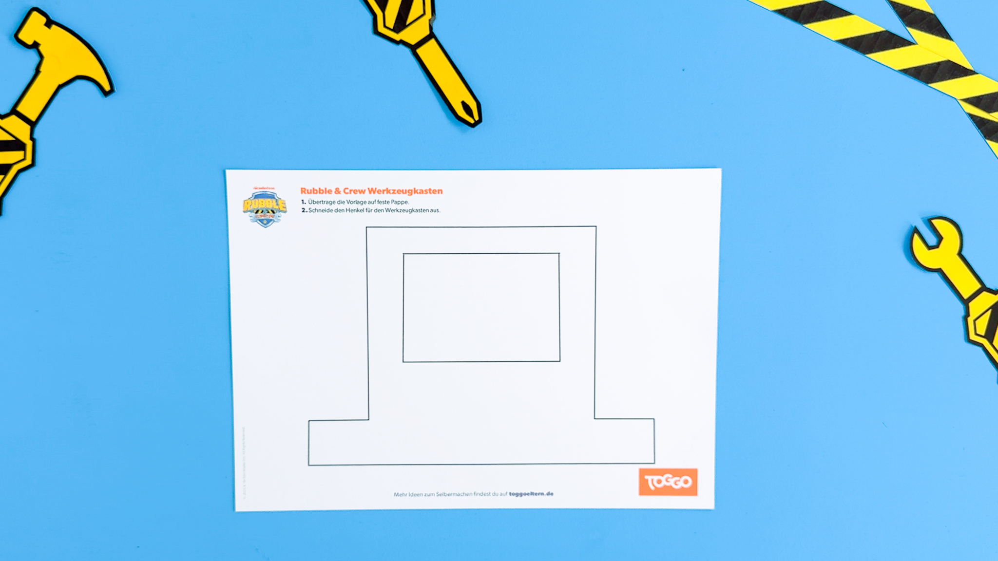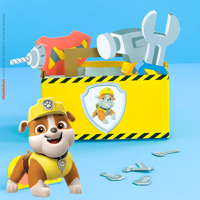 Rubble & Crew schenkt kleinen Baumeistern ihren ersten eigenen Werkzeugkasten. Keine Sorge, es kann nichts ins Auge gehen, denn der Kasten und das Werkzeug bestehen aus Papier und Pappe. Alles Materialien, die ihr garantiert zuhause habt. Ein tolles Projekt für alle Kinder, die es lieben, wie Rubble zu bauen und zu tüfteln.