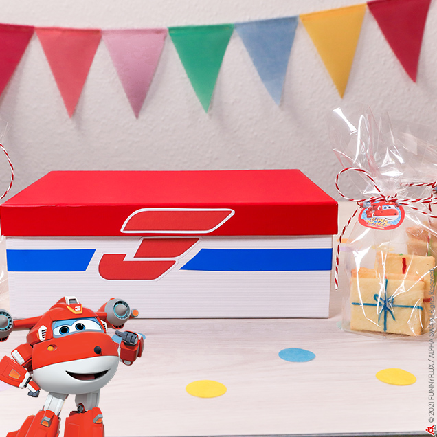 Alternativ könnt ihr das Paket auch als Geschenkverpackung für das Geburtstagskind nutzen und die leckeren Paket-Kekse zum Beispiel als kleines Gastgeschenk an alle Super Wings-Fans verteilen!