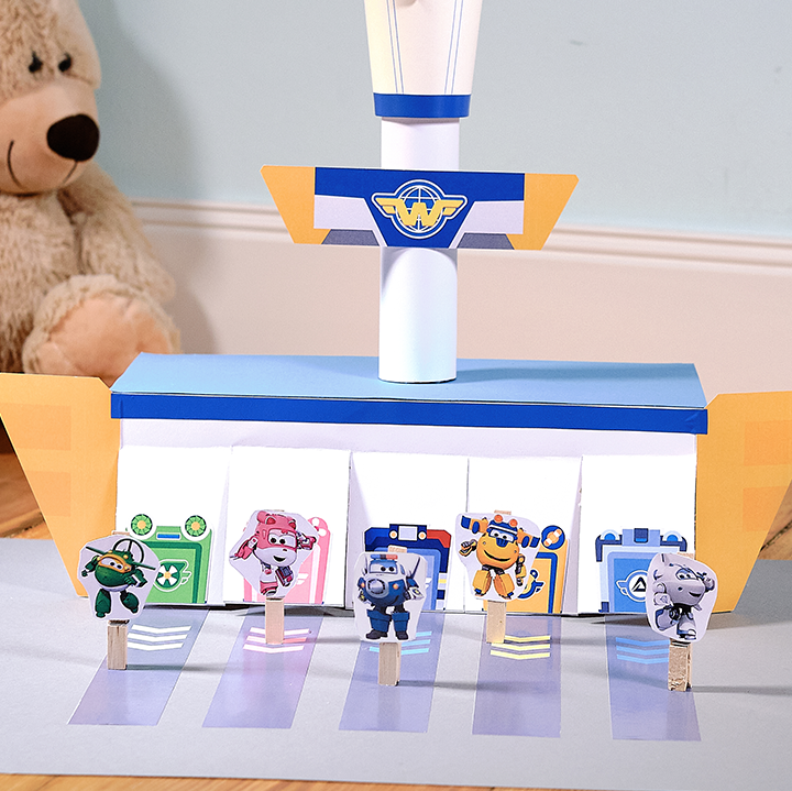 Bastel deine eigene Zentrale der Super Wings mit einem Flughafen inklusive Kontrollzentrum, Landebahnen und Garagen. Hier können die Super Wings nach Belieben starten, landen und sich für neue Missionen in ihren Garagen ausruhen.
