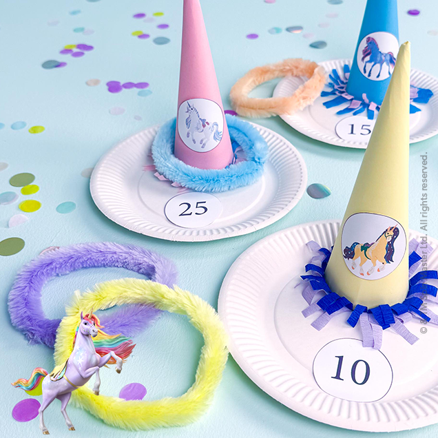 Keine Ahnung, mit welchem Partyspiel man kleine Einhorn-Fans beim Motto-Geburtstag begeistern kann? Unser zauberhaftes Unicorn Academy Wurfspiel zum Selberbasteln ist die Lösung! Es bereitet doppelt Freude – beim Basteln und beim Spielen, wenn die Kinder versuchen, das Horn mit den Ringen zu treffen. Ein einfaches Ringwurfspiel aber im besonderen Einhorn-Look.
