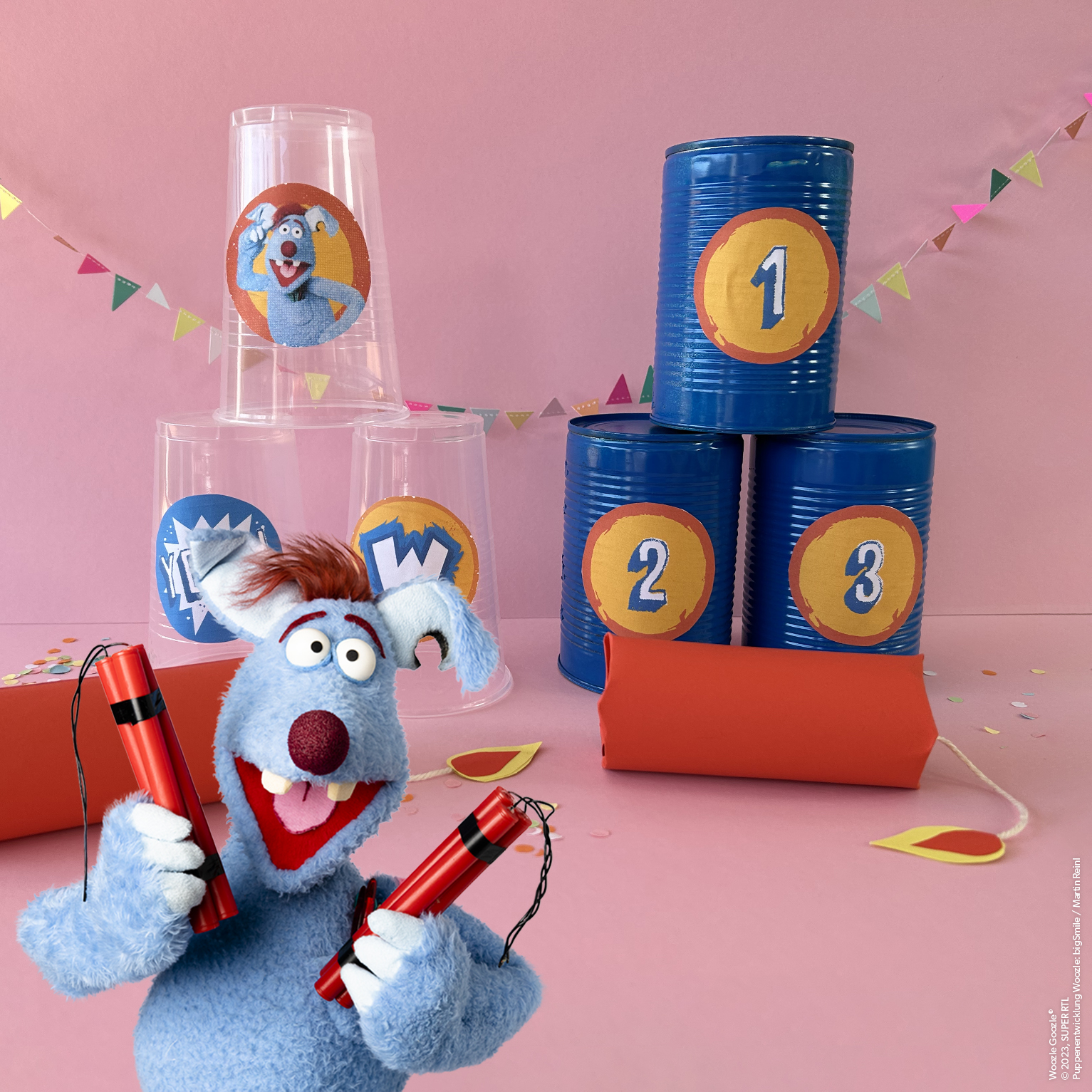 Jetzt macht es BOOM und BÄMM, denn beim Woozle Dosenwerfen wird es laut und spaßig. Wir zeigen dir, wie du das perfekte Spiel für die Woozle Motto-Geburtstagsparty deiner Kids vorbereitest. Das Highlight des Spiels: Passend zum blauen Lieblingserfinder deiner Kids werden die Dosen mit selbstgebastelten Dynamitstangen umgeworfen. Viel Spaß!