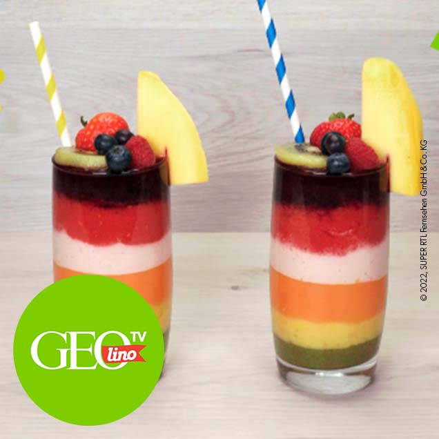 Eine Vitamin-Bombe für den Sommer! Mit dem GEOLINO TV Regenbogen-Smoothie gelingt ein echter Hingucker aus verschiedenen frischen Früchten. Ganz ohne zusätzlichen Zucker kreierst du so das neue Lieblingsgetränk für deine Kleinen.