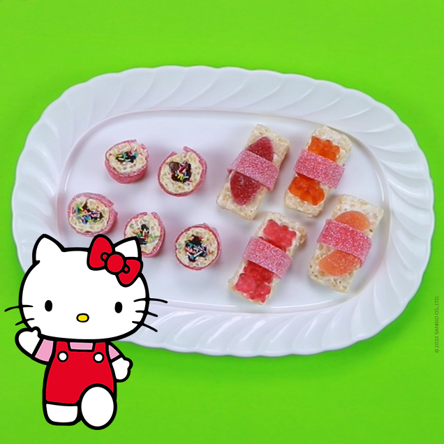 Deine Kleinen sind noch nicht auf den Geschmack von Fisch gekommen? Wer sagt denn, dass man Sushi nicht auch mal anders zubereiten kann?! Hier findest du Rezeptvorschläge für Hello Kittys süßes Sushi. Das ist der perfekte Nachtisch für einen Familien-Filmabend! Schnappt euch eure Lieblingsleckereien und belegt den Puffreis! So wird jeder glücklich und satt. Übrigens: Das süße Sushi kannst du auch super als Snack auf dem nächsten Hello Kitty Motto-Geburtstag servieren!