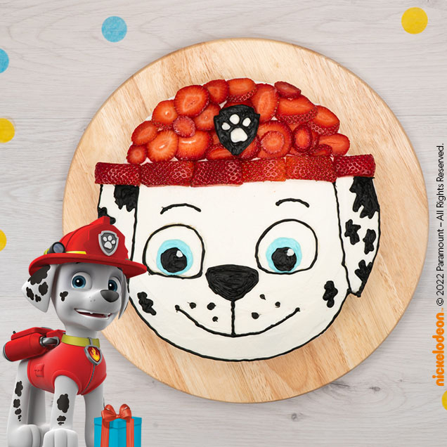 Aufgepasst, hier kommt Marshall mit seinem Geburtstagskuchen! Der leckere Vanillekuchen wird mit einer lockeren Quark-Sahne-Creme überzogen und mit frischen Erdbeeren und eingefärbter Schokolade dekoriert. Damit wird dieser tolle Motto-Kuchen zum Highlight auf jeder PAW Patrol-Party!