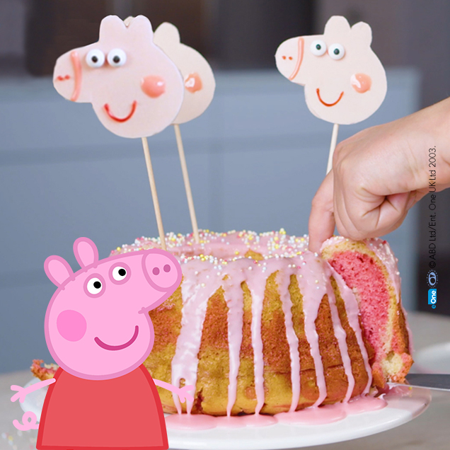 Dieser Gugelhupf mit essbaren Peppa Cake Toppern sieht nicht nur von außen super aus, sondern überrascht mit einem weiß-pink-gemusterten Innenleben. Bei so einem peppig-pinken Kuchen staunt nicht nur Peppa Pig, sondern auch große und kleine Fans!