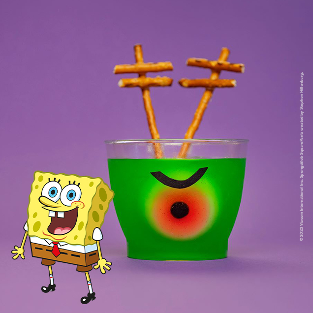 Wessen Auge starrt dich hier so gruselig an? Natürlich das von Plankton! Aber keine Sorge, das Auge ist aus Fruchtgummi und schmeckt lecker, genauso wie der Wackelpudding in dem es steckt. Auf der Halloween-Party deiner Kids wird der Plankton Wackelpudding daher garantiert zum Hit.