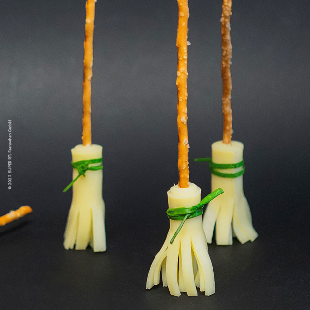 Die "Salzigen Besen" sind eine tolle Deko für das Buffet auf der Halloween-Party deiner Kids. Doch sie sind nicht nur eine schaurig-schöne Deko sondern auch ein leckerer Snack. Alles was du für die "Salzigen Besen" brauchst sind Salzstangen und Käse und schon hast du sie im Handumdrehen zubereitet.
