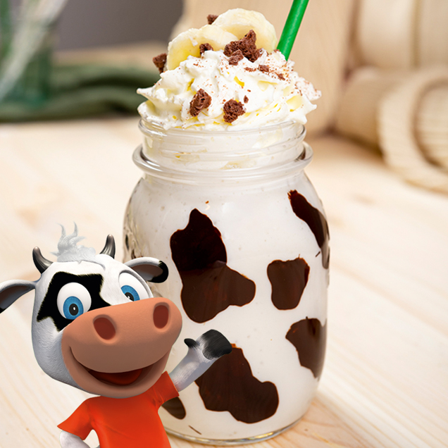 Gieße den Milchshake in das kalte Kuhflecken Glas.