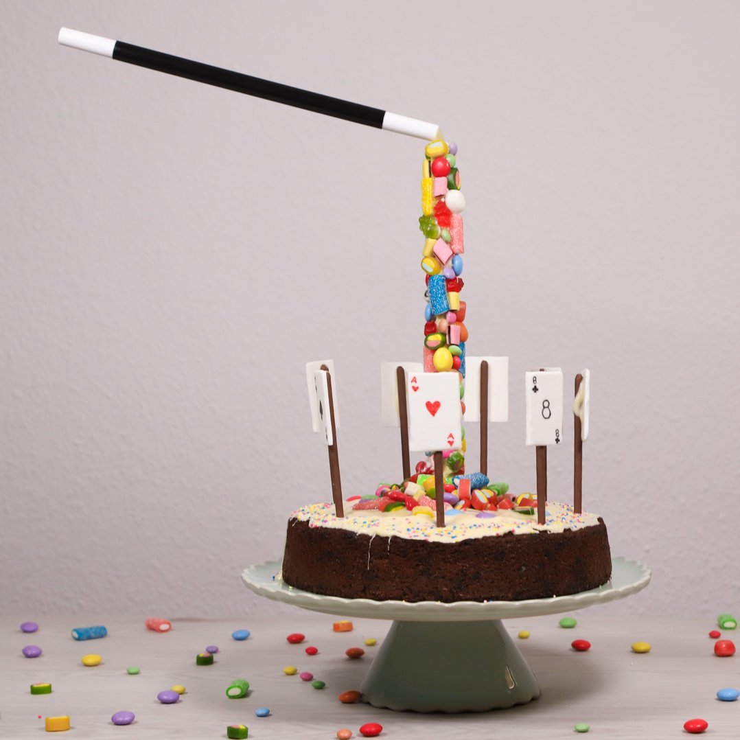 Dieser Zauberkuchen ist das Highlight auf dem nächsten Zauber-Geburtstag! Wie von Zauberhand rieseln jede Menge Süßigkeiten aus dem schwebenden Zauberstab - einfach magisch, oder?