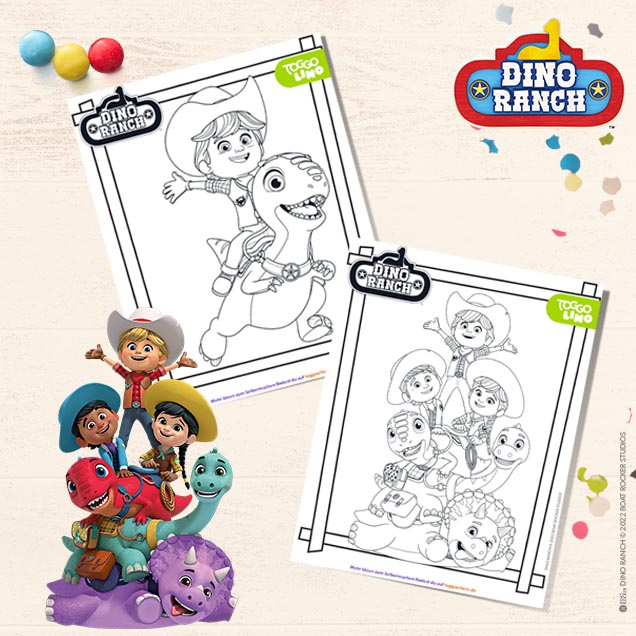 Jetzt wird es bunt! Min, Jon, Miguel und ihre Dino-Freunde könnten etwas Farbe vertragen. Also schnappt euch eure Buntstifte und bringt ein wenig Farbe auf die Dino Ranch. Einfach dinostark!