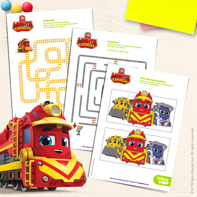 Hier gibt es altersgerechte Rätsel für deinen kleinen Mighty Express-Fan. Gemeinsam mit Nick, Bruno und Milo finden deine Kids durch Irrgarten und Labyrinthe oder entdecken Unterschiede an den Loks. Einfach runterladen und ausdrucken - schon kann der Knobelspaß los gehen!